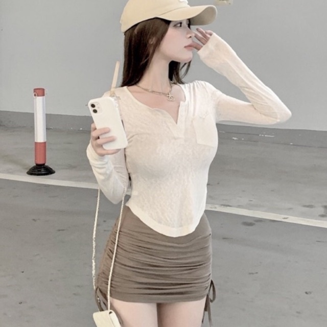 Áo croptop cổ V tay dài sexy nhẹ nhẹ, vải đẹp mịn, co giản tốt📸Hình thật tại shop 22.July📸